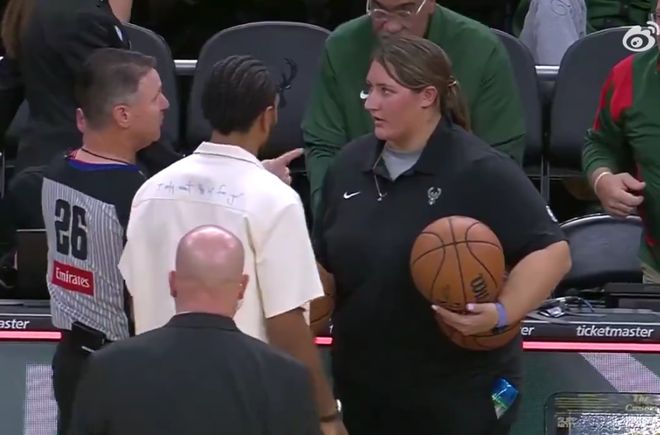 裁判随后将球交给了雄鹿主场的装备管理人员。